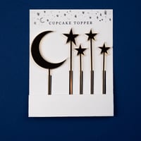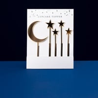 A pack of acrylic celestial cupcake toppers, made in the UK by Suzanne Oddy Design Ltd.