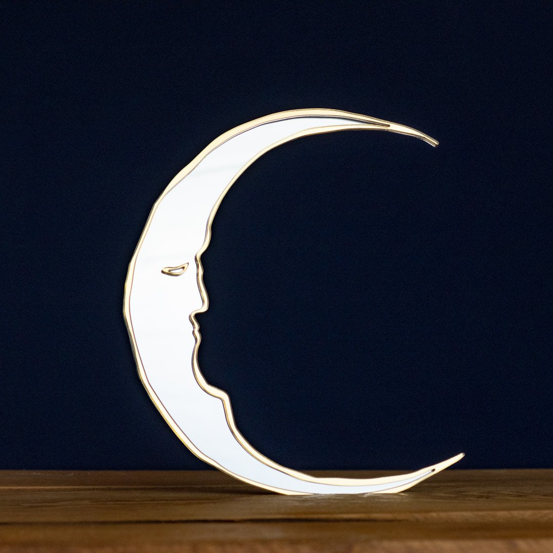 This lightweight mirror is made from shatter proof acrylic (not glass) & features a silver crescent moon framed with gold mirror detailing.