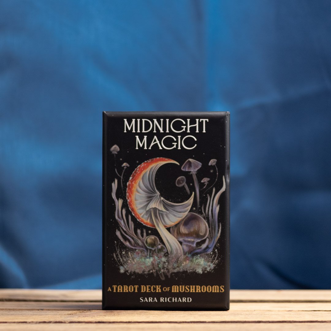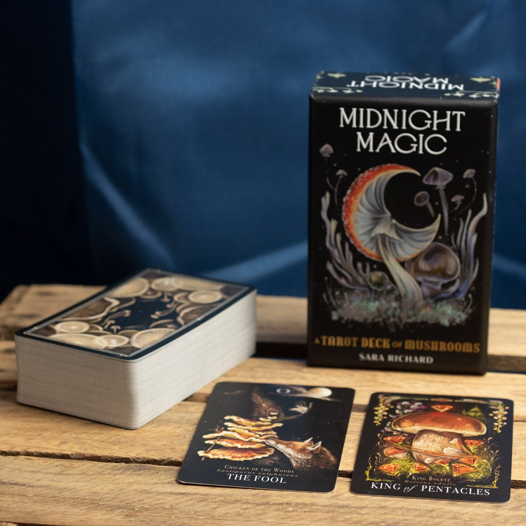 A Tarot Deck of Mushrooms featuring dark, dreamy illustrations of beautiful fungi. The Midnight Magic deck reflects the themes & archetypes of the traditional Rider Waite Tarot deck, with 78 unique tarot card designs based on the mysterious world of mushrooms.