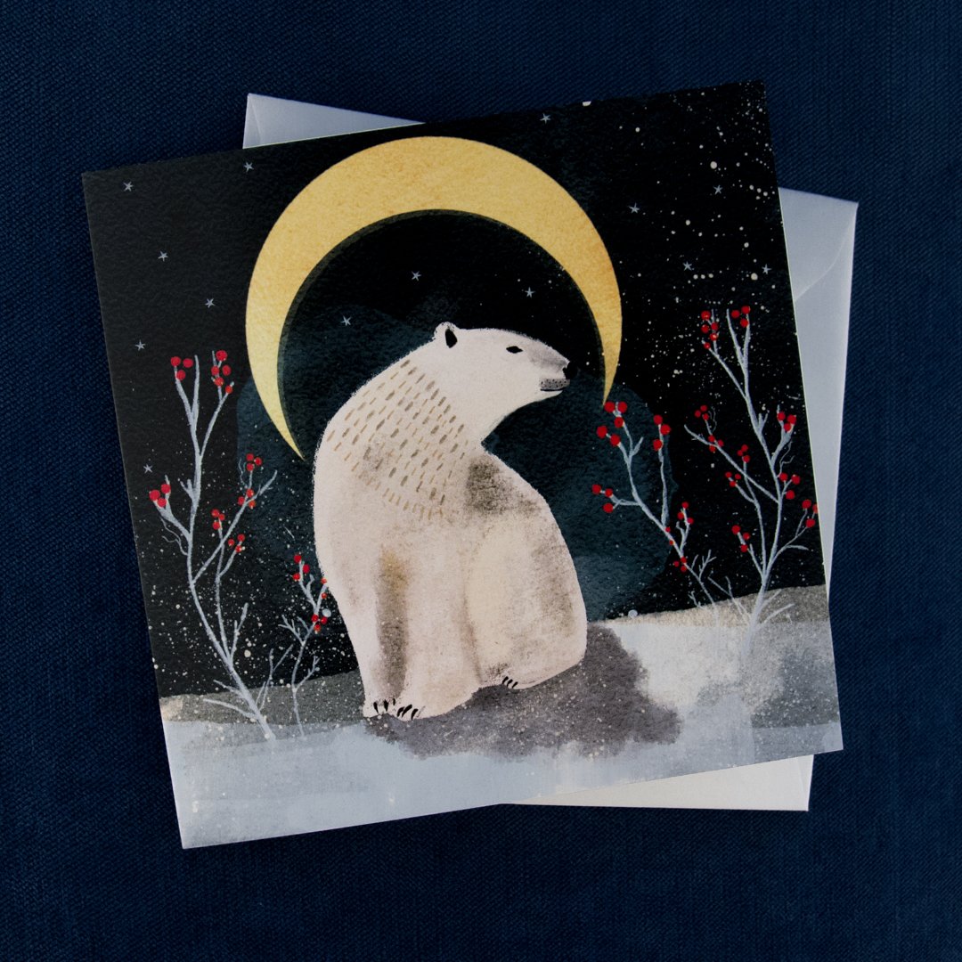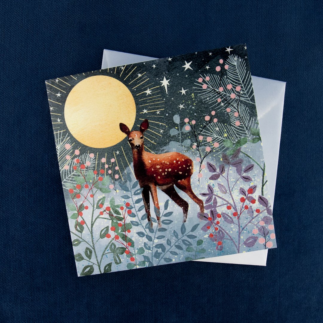 The pack contains five cards designs: owl, polar bear, hare, fox & deer ~ each under a glowing winter moon.
