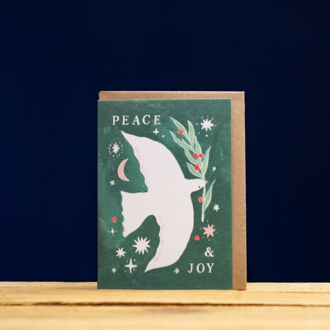 A mini Christmas card with a dove of peace, flying by the light of a Crescent moon, with festive green colours. Reads 'Peace & Joy'.