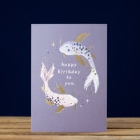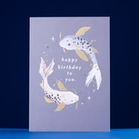 A unique gold-foiled card for Pisces, with two sparkling Koi. Reads "Happy Birthday to You".